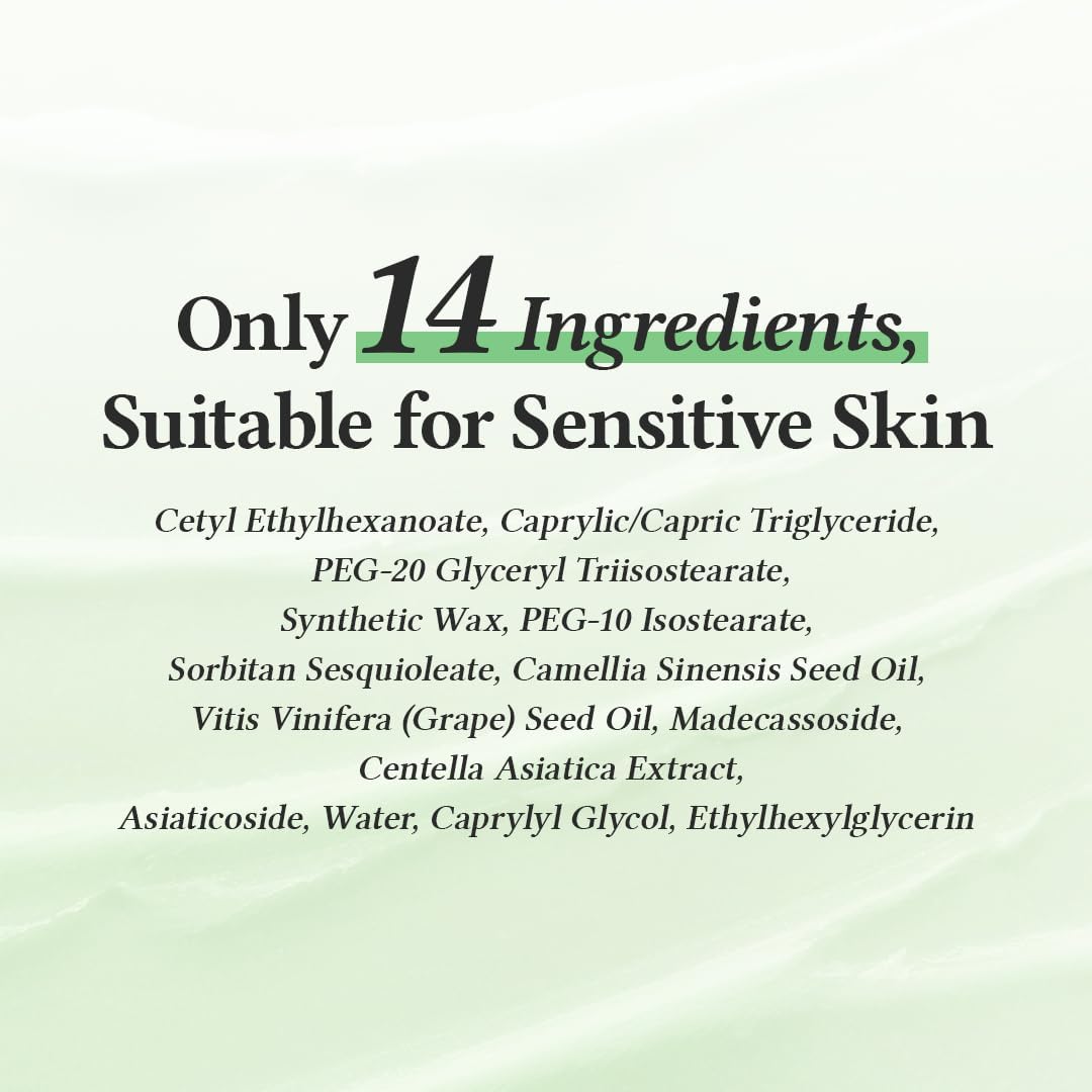 Cetil etilhexanoato, cera sintética, triglicérido caprílico/cáprico, sesquioleato de sorbitán, isoestearato de PEG-10, triisoestearato de glicerilo PEG-20, caprilil glicol, etilhexilglicerina, aceite de semilla de Camellia sinensis, aceite de semilla de Vitis vinifera (uva), madecasósido, extracto de Centella asiática, asiaticósido, agua.