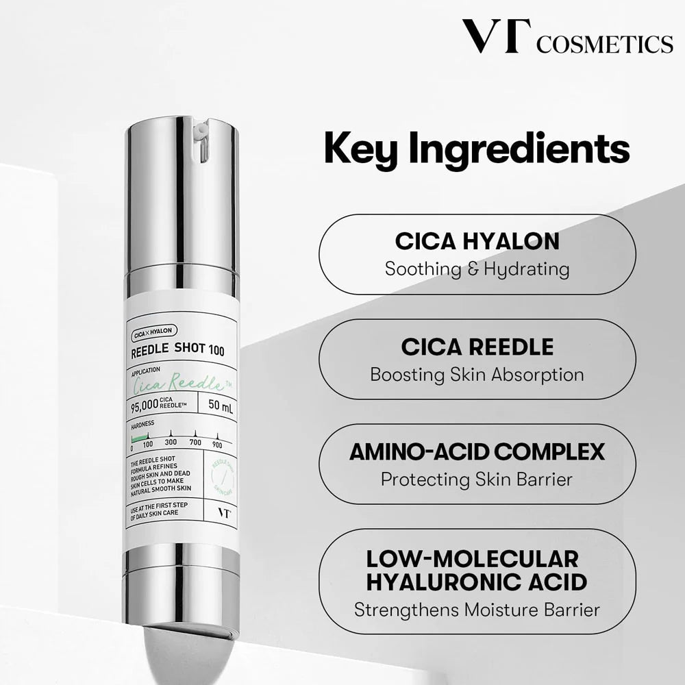 - Después de la limpieza nocturna, aplicá VT Reedle Shot 300, distribuyendo de forma uniforme y masajeando hasta su completa absorción.